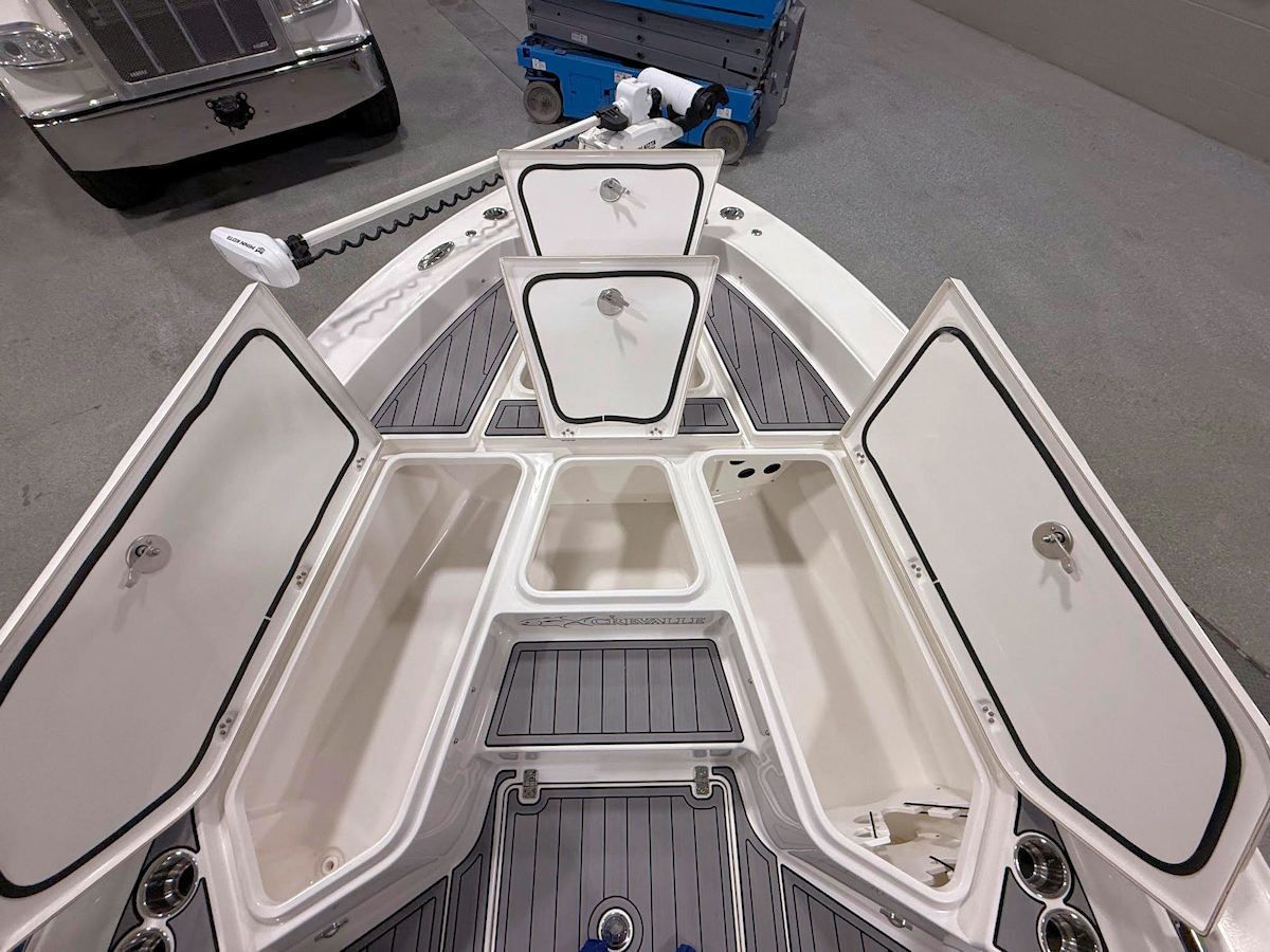 - Expansive Cockpit. Dual live wells, insulated fish boxes, tackle center, and dive door